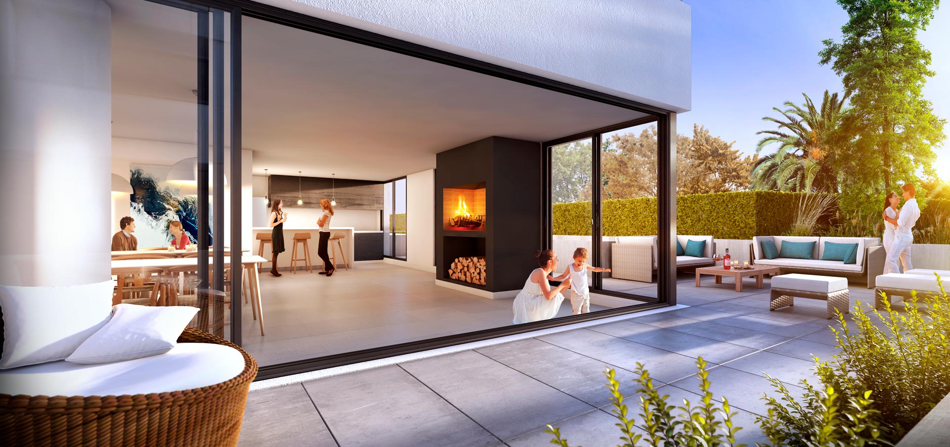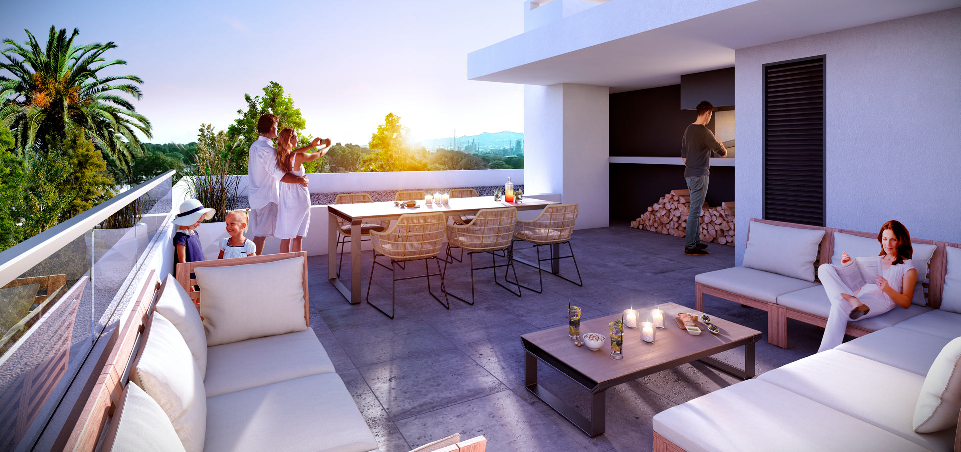 Debajo de las edificaciones, próximo a los accesos y contiguo a los espacios exteriores enjardinados se localiza el Salón de Usos Múltiples (SUM) y su terraza exterior. Además el proyecto cuenta con parrilleros exteriores con vistas panorámicas de la ciudad, unidades con cerradura digita, acceso a través de tarjetas magnéticas, Seguridad a través de CCTV, WiFi en áreas comunes, juegos para niños y zona fitness.