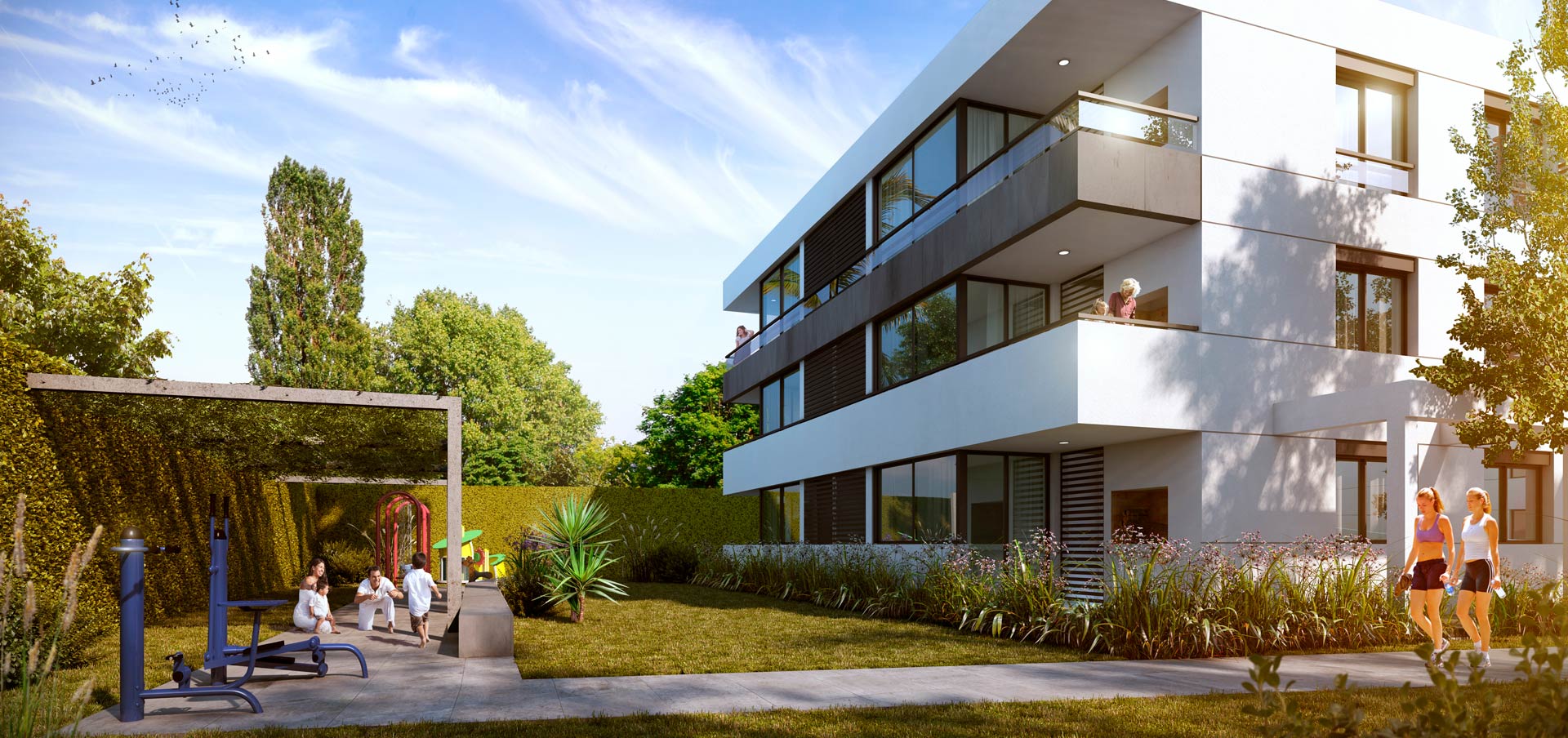 El proyecto se caracteriza por poseer un área enjardinada de uso común de 800 m2 a lo que se suman las áreas exteriores comunes de uso exclusivo de los apartamentos. Ambas áreas enjardinadas constituyen una unidad que permite que los volúmenes edificados se perciban inmersos en espacios exteriores verdes, que dan continuidad a la vocación ambiental del barrio.